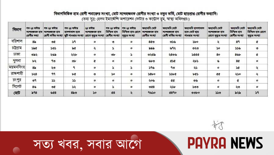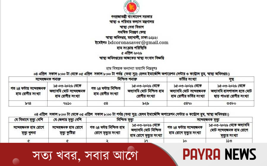 এক দিনে হাম ও উপসর্গ নিয়ে ১২ জনের মৃত্যু PAYRA NEWS PAYRA NEWS প্রকাশিত: ৯:১২ অপরাহ্ণ, এপ্রিল ৫, ২০২৬ ছবি: সংগৃহীত ডেস্ক রিপোর্ট: গত ২৪ ঘণ্টায় দেশে হামে আক্রান্ত হয়ে দুজনের মৃত্যু হয়েছে। একই সময়ে উপসর্গ নিয়ে আরও ১০ জনের মৃত্যু হয়েছে বলে জানিয়েছে স্বাস্থ্য অধিদপ্তর। রবিবার (৫ এপ্রিল) স্বাস্থ্য অধিদপ্তরের স্বাস্থ্যবিষয়ক সংবাদ বিজ্ঞপ্তিতে এসব জানা গেছে। বিজ্ঞপ্তিতে, শনিবার (৪ এপ্রিল) সকাল ৮টা থেকে রবিবার (৫ এপ্রিল) সকাল ৮টা পর্যন্ত ২৪ ঘণ্টায় সারা দেশের হাম সংক্রমণ পরিস্থিতির বিস্তারিত তথ্য তুলে ধরা হয়। স্বাস্থ্য অধিদপ্তরের তথ্য অনুযায়ী, গত ২৪ ঘণ্টায় নিশ্চিতভাবে হামে আক্রান্ত হয়ে একজন রোগী ঢাকা বিভাগে এবং অন্য একজন ময়মনসিংহ বিভাগে মারা গেছে। এ ছাড়া হামের উপসর্গ নিয়ে খুলনা বিভাগে ৫ জন, রাজশাহী বিভাগে ৩ জন এবং চট্টগ্রাম বিভাগে ২ জনের মৃত্যু হয়েছে। স্বাস্থ্য অধিদপ্তরের সংবাদ বিজ্ঞপ্তি বলছে, গত ২৪ ঘণ্টায় নিশ্চিত হাম রোগীর সংখ্যা ৫৪ জন এবং সন্দেহজনক হাম রোগীর সংখ্যা ৯৭৪ জন। এ নিয়ে গত ১৫ মার্চ থেকে আজ ৫ এপ্রিল (সকাল ৮টা) পর্যন্ত সারা দেশে নিশ্চিত হাম রোগীর সংখ্যা বেড়ে দাঁড়িয়েছে ৯২৯ জন এবং সন্দেহজনক হাম রোগীর সংখ্যা দাঁড়িয়েছে ৫ হাজার ৪৭০ জন। এছাড়া, গত ১৫ মার্চ থেকে এখন পর্যন্ত হাসপাতাল থেকে ছাড়া পেয়েছে ৩ হাজার ৩৮০ জন রোগী। SHARES স্বাস্থ্য বিষয়:
