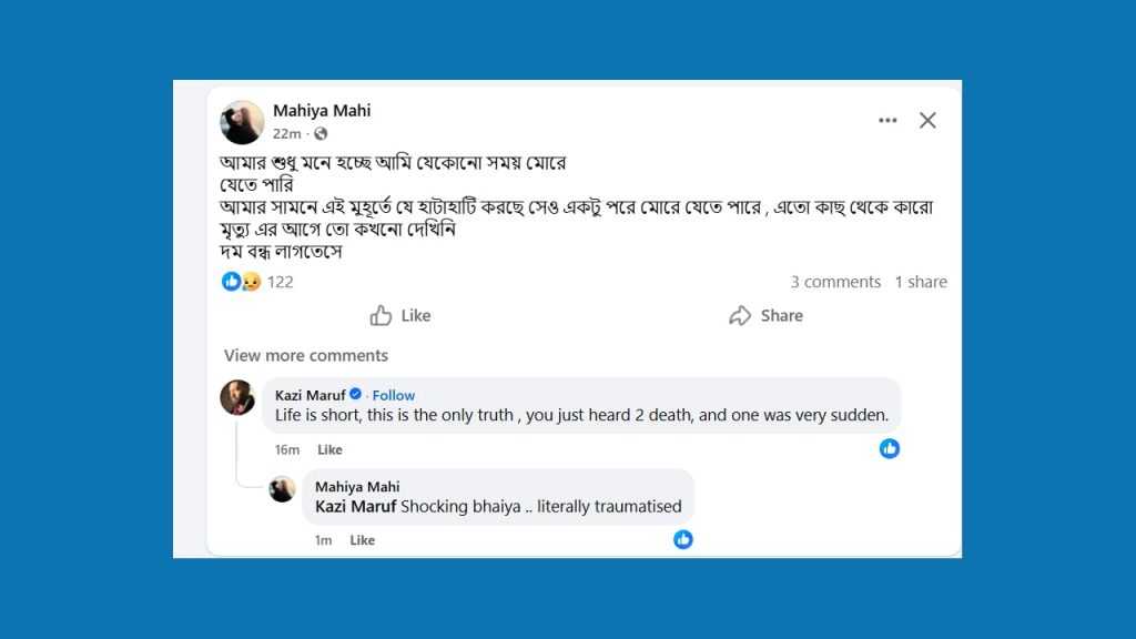 যেকোনো সময় মরে যেতে পারি : মাহিয়া মাহি PAYRA NEWS PAYRA NEWS প্রকাশিত: ৯:৩২ পূর্বাহ্ণ, মার্চ ২৩, ২০২৬ ডেস্ক রিপোর্ট: ঢাকাই চলচ্চিত্রের এক সময়ের শীর্ষ নায়িকা মাহিয়া মাহি। রূপালি পর্দার পাশাপাশি সামাজিক যোগাযোগ মাধ্যমেও সমান তালে সরব তিনি। নিজের ব্যক্তিগত জীবনের খুঁটিনাটি, ভালো লাগা কিংবা ক্যারিয়ারের আপডেট সবই ভক্তদের সঙ্গে ভাগ করে নেন নিয়মিত। বর্তমানে এই নায়িকা অবস্থান করছেন সুদূর আমেরিকায়। সেখান থেকেই এক ফেসবুক পোস্টে মাহি জানালেন, যেকোনো সময় মরে যেতে পারেন তিনি! ফেসবুক পেজে দেওয়া এক পোস্টে মাহি লিখেছেন, ‘আমার শুধু মনে হচ্ছে আমি যেকোনো সময় মরে যেতে পারি।’ অভিনেত্রীর এমন মন্তব্যে ভক্তদের মনে উদ্বেগ সৃষ্টি হলেও পরের লাইনেই মাহি পরিষ্কার করেন তার এমন অনুভূতির পেছনের কারণ। সম্ভবত চোখের সামনে আকস্মিক কোনো মৃত্যুর ঘটনা দেখে বিচলিত হয়ে পড়েছেন তিনি। মাহি আরও লিখেছেন, ‘আমার সামনে এই মুহূর্তে যে হাঁটাহাটি করছে সেও একটু পরে মরে যেতে পারে, এতো কাছ থেকে কারো মৃত্যু এর আগে তো কখনো দেখিনি দম বন্ধ লাগতেসে।’ ঠিক কী কারণে বা কার মৃত্যু দেখে মাহি এমন পোস্ট দিয়েছেন সে বিষয়ে বিস্তারিত কিছু জানাননি তিনি। তবে তার এই স্ট্যাটাসে স্পষ্ট যে, জীবনের চরম অনিশ্চয়তা তাকে গভীরভাবে নাড়া দিয়েছে। SHARES বিনোদন বিষয়: ঢাকাই চলচ্চিত্রের এক সময়ের শীর্ষ নায়িকা মাহিয়া মাহি। রূপালি পর্দার পাশাপাশি সামাজিক যোগাযোগ মাধ্যমেও সমান তালে সরব তিনি। নিজের ব্যক্তিগত জীবনের খুঁটিনাটিভালো লাগা কিংবা ক্যারিয়ারের আপডেট সবই ভক্তদের সঙ্গে ভাগ করে নেন নিয়মিত।